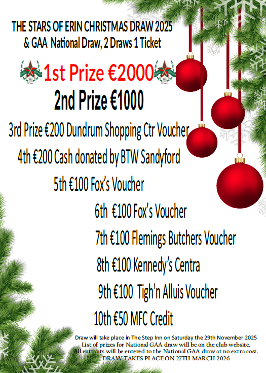 Purchase of a ticket will also automatically enter the buyer into the GAA national draw in March 2026 with incredible prizes and a top draw prize of €50,000.